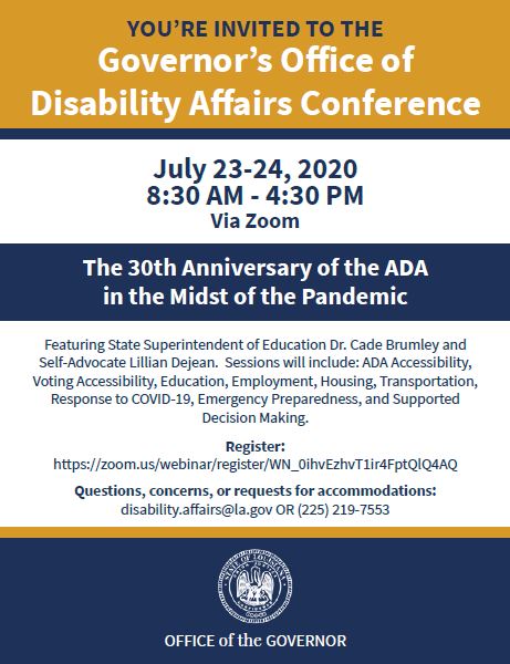 The Governor's Office of Disability Affairs (GODA) will host its annual conference on July 23rd and 24th. The theme for the 2020 GODA Conference is "The 30th Anniversary of the ADA in the Midst of a Pandemic." Due to social distancing measures, this year's conference will be held virtually via Zoom.